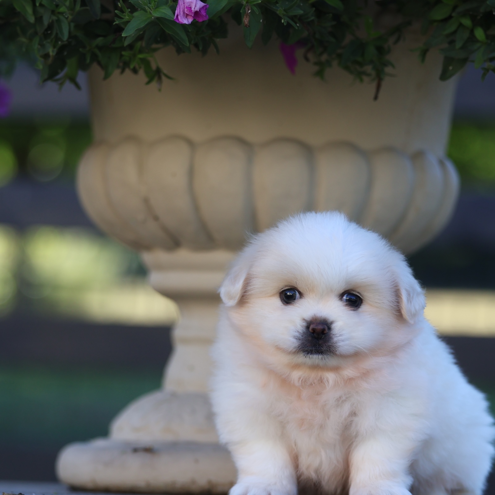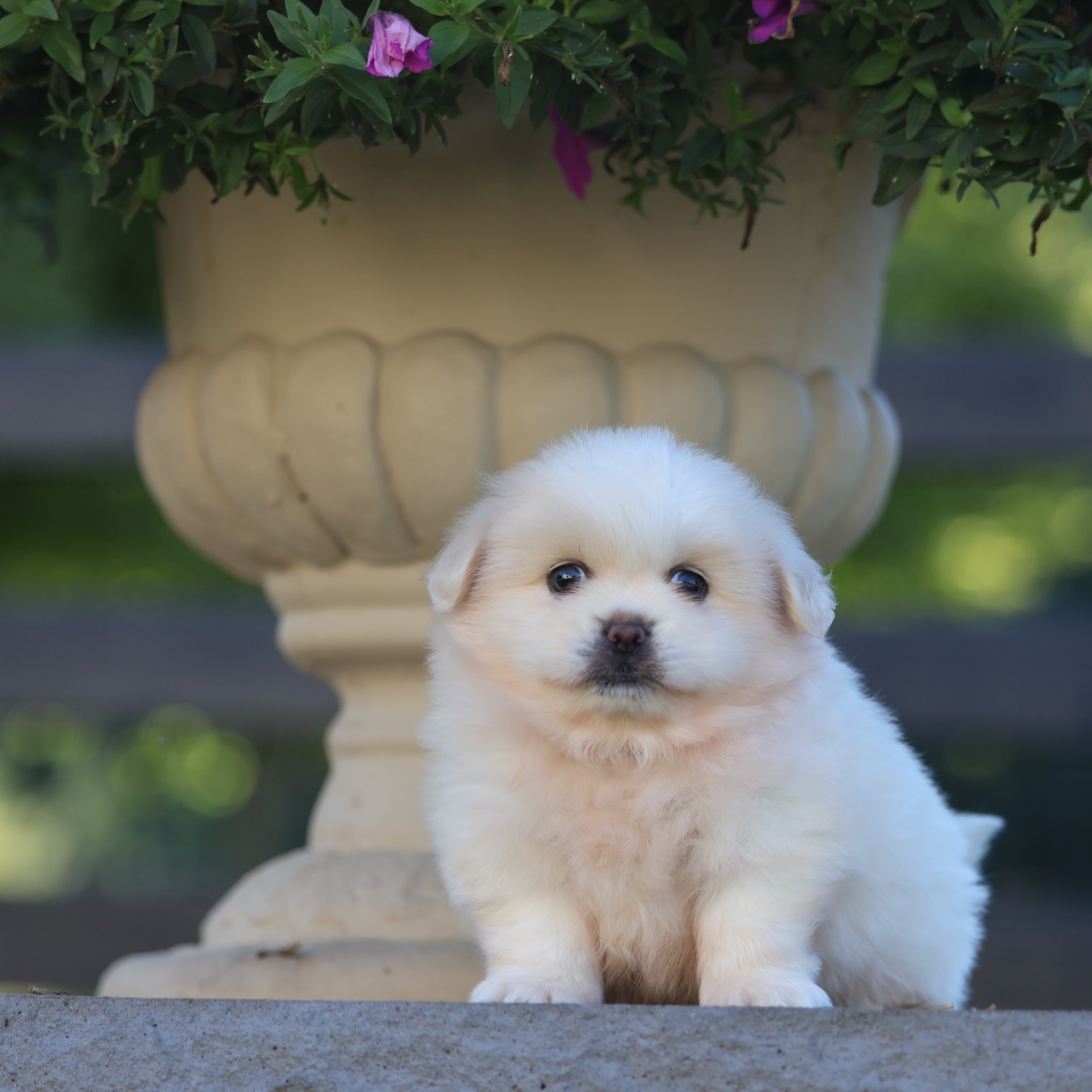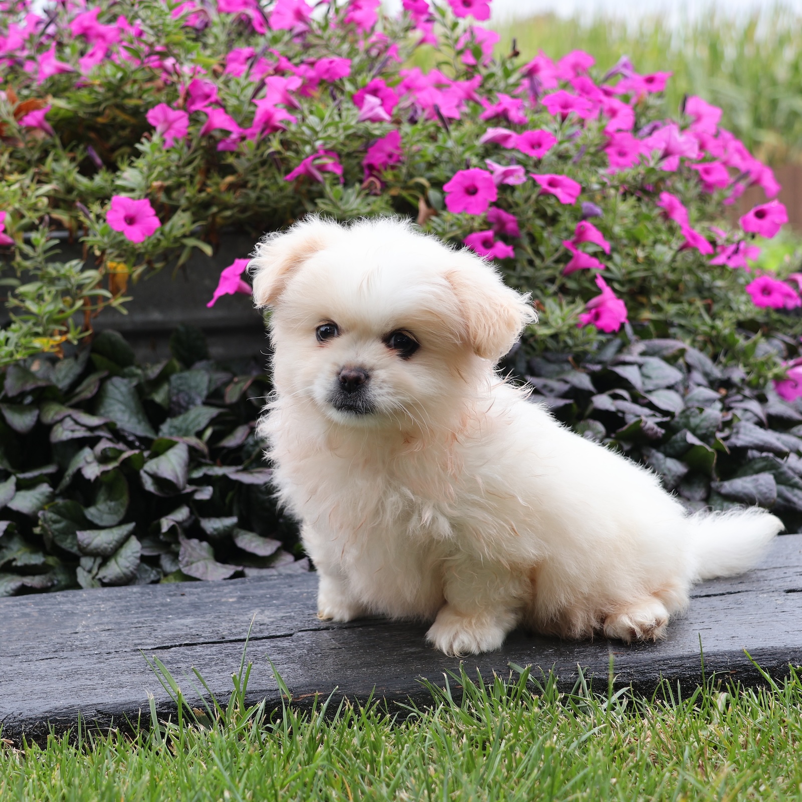 Snowball is an irresistibly sweet Peekapom puppy, a designer mix between a Pekingese and a Pomeranian. This unique combination creates a small, fluffy companion with a big heart and an even bigger personality. Known for their teddy bear-like appearance and affectionate nature, Peekapoms are the perfect blend of playful energy and cuddly charm.