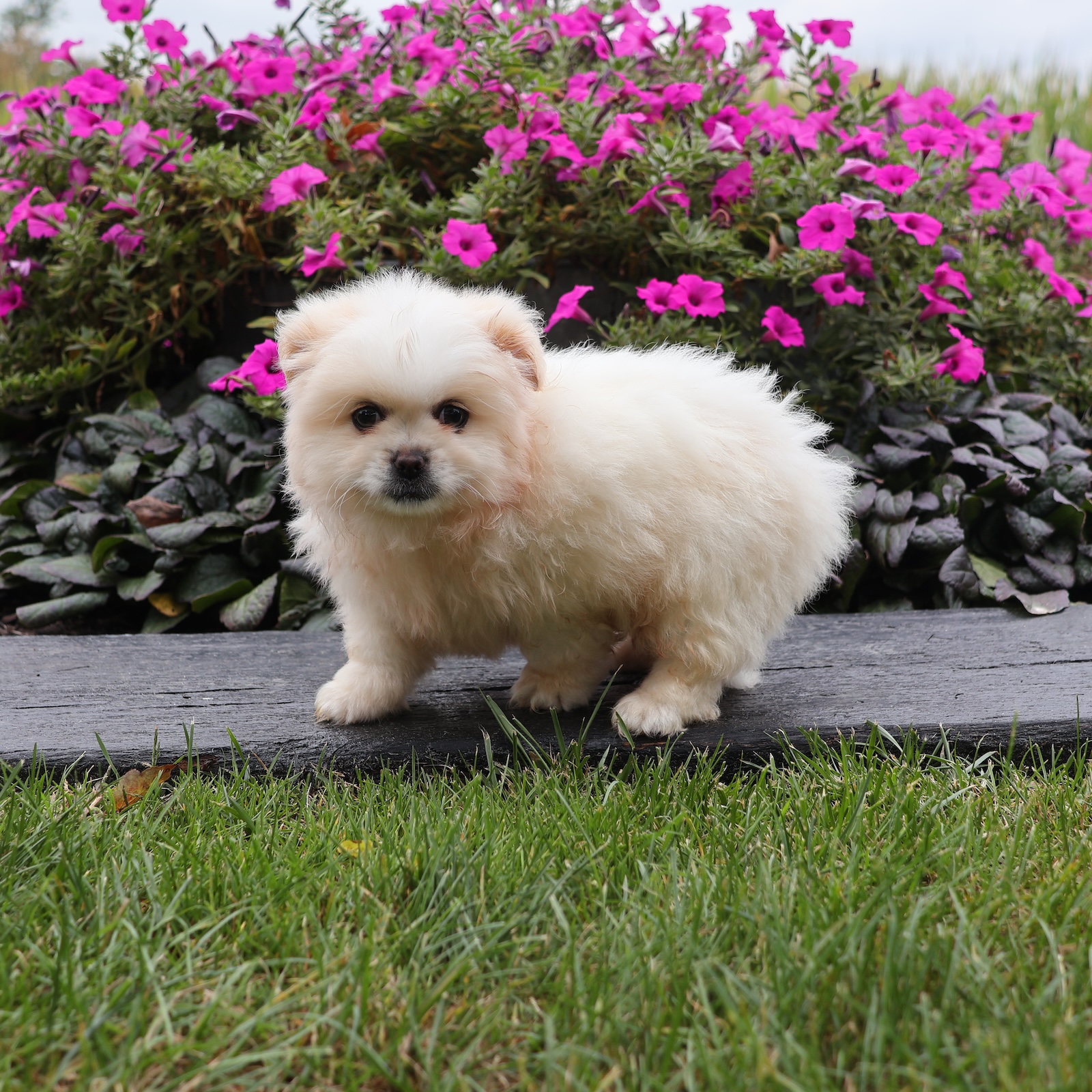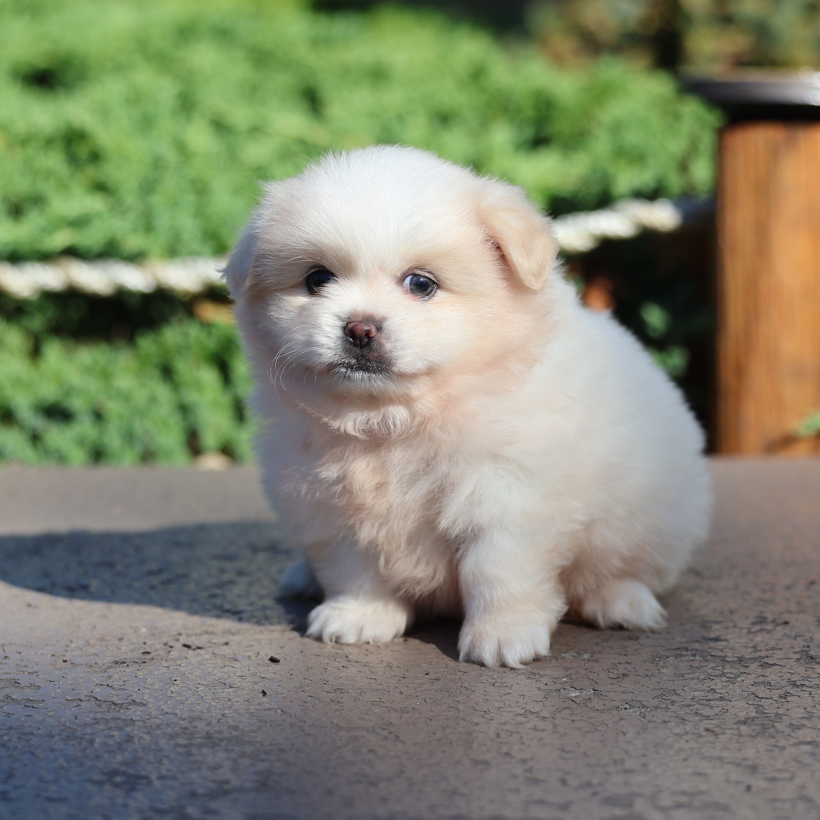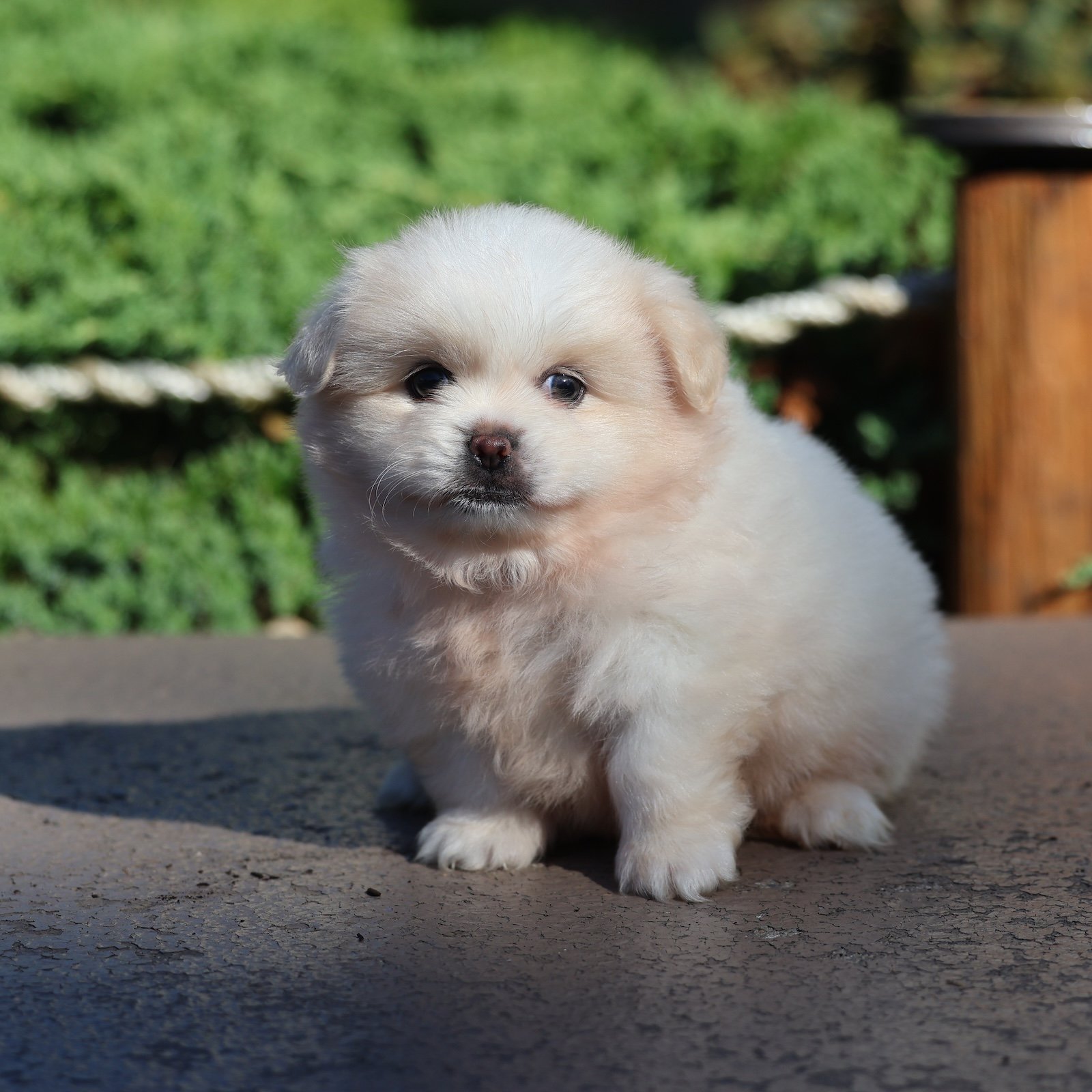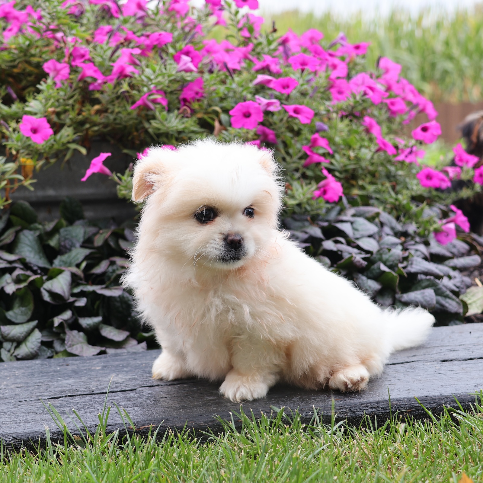 Snowball is an irresistibly sweet Peekapom puppy, a designer mix between a Pekingese and a Pomeranian. This unique combination creates a small, fluffy companion with a big heart and an even bigger personality. Known for their teddy bear-like appearance and affectionate nature, Peekapoms are the perfect blend of playful energy and cuddly charm.