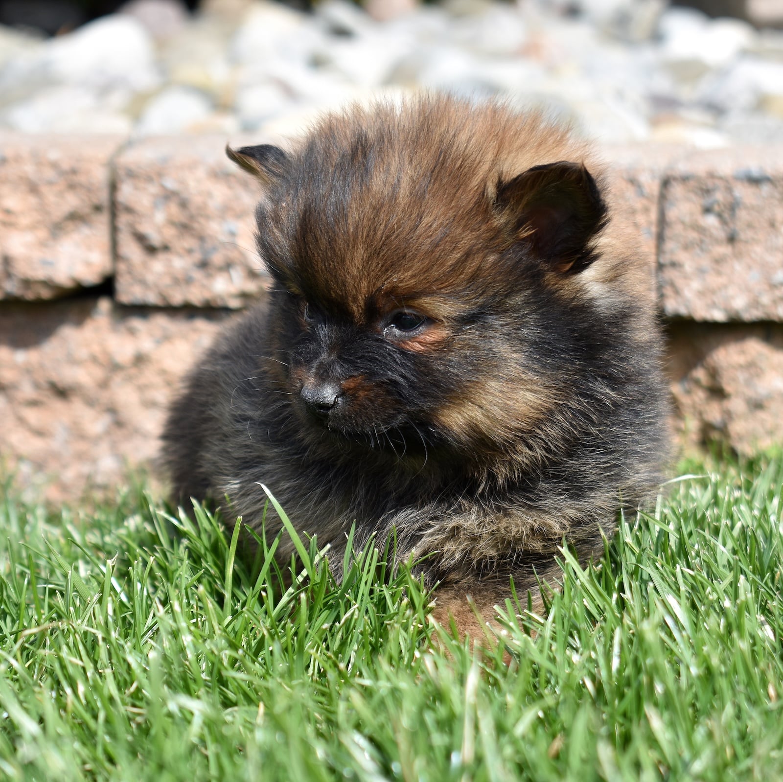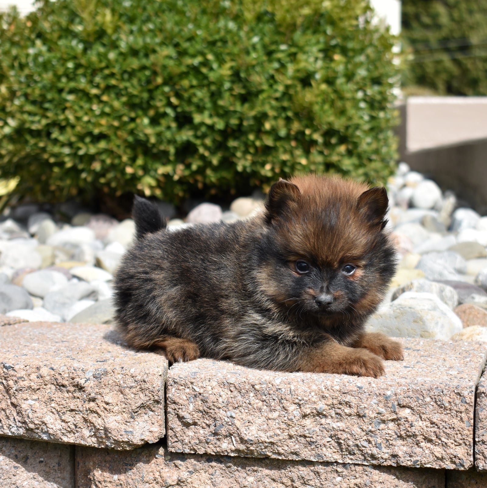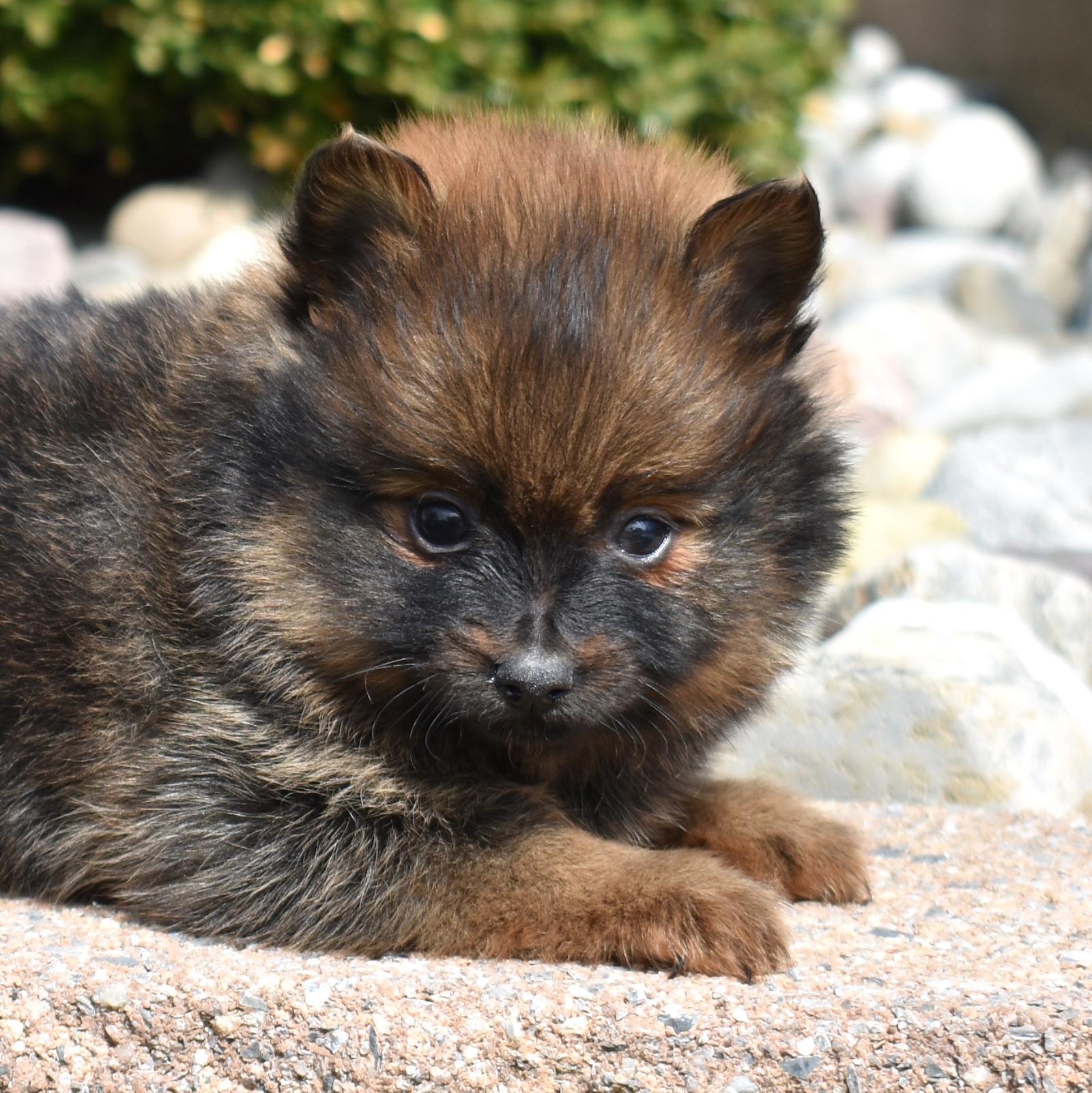 Poppy is a striking little Pomeranian with a beautifully patterned coat featuring rich black and warm brown markings. Her fluffy fur creates a bold contrast that highlights her bright eyes and playful expression. With an expected adult weight of just 5–6 pounds, Poppy will remain a perfectly petite companion while still showcasing the lively personality that makes Pomeranian puppies for sale so popular.