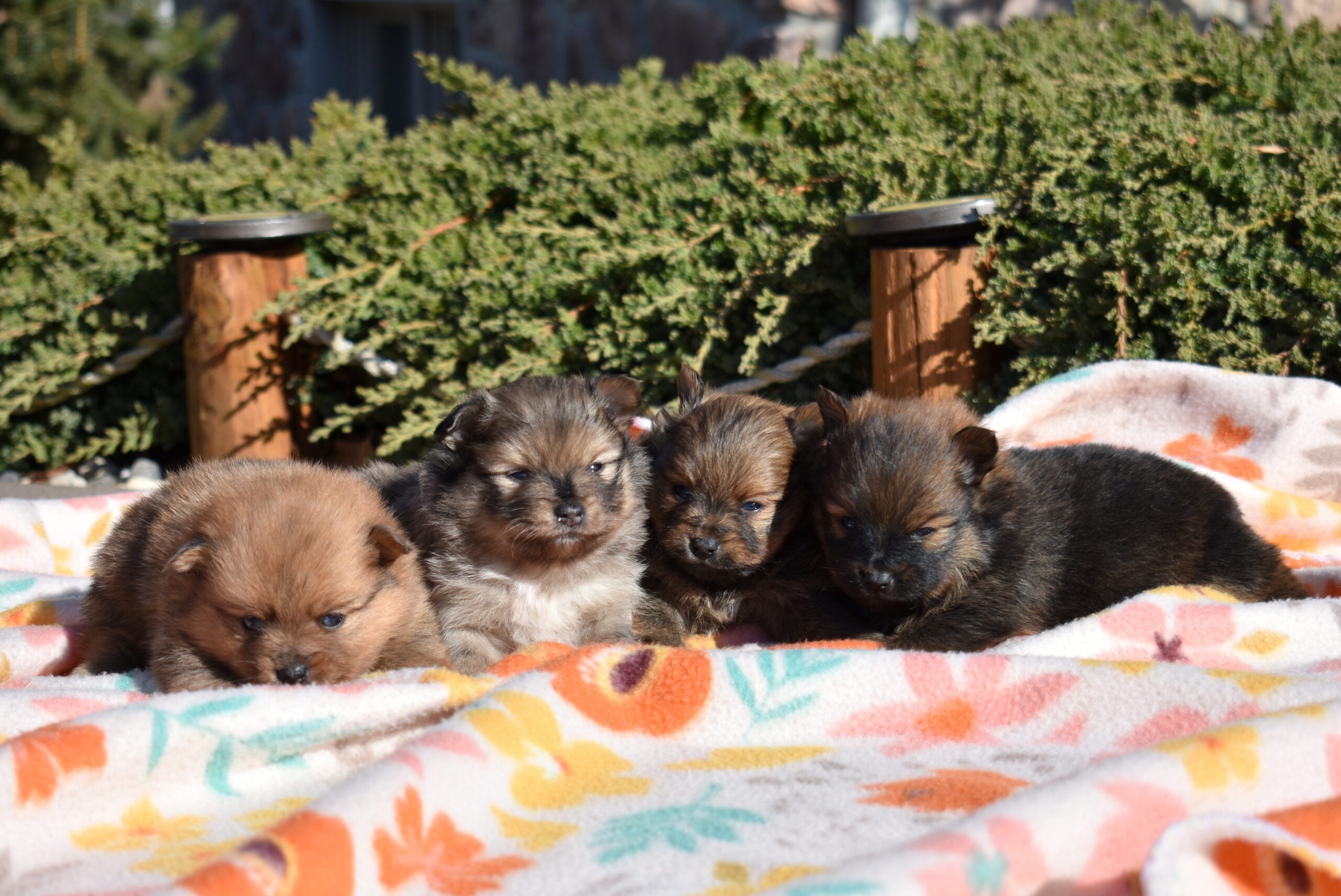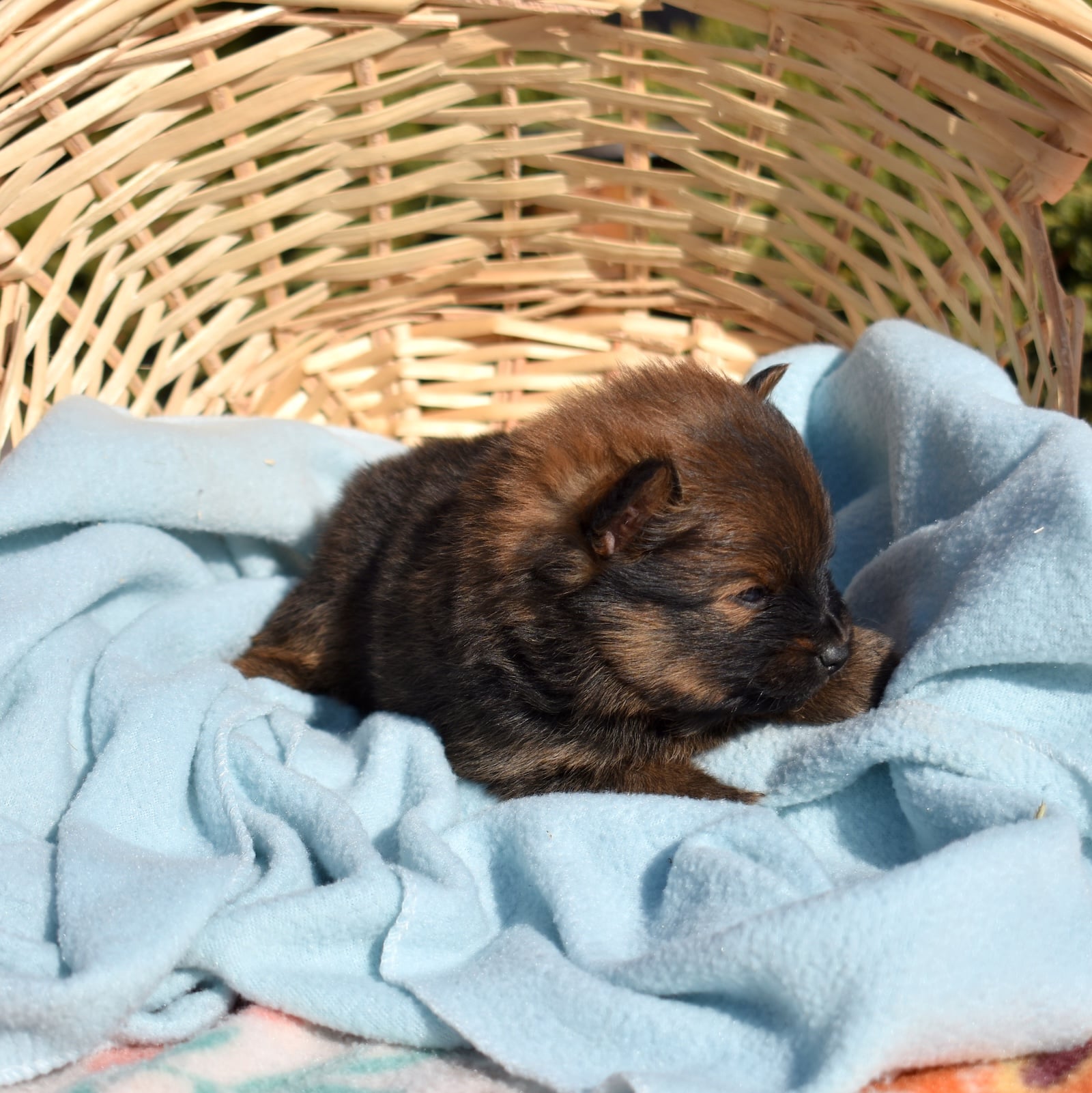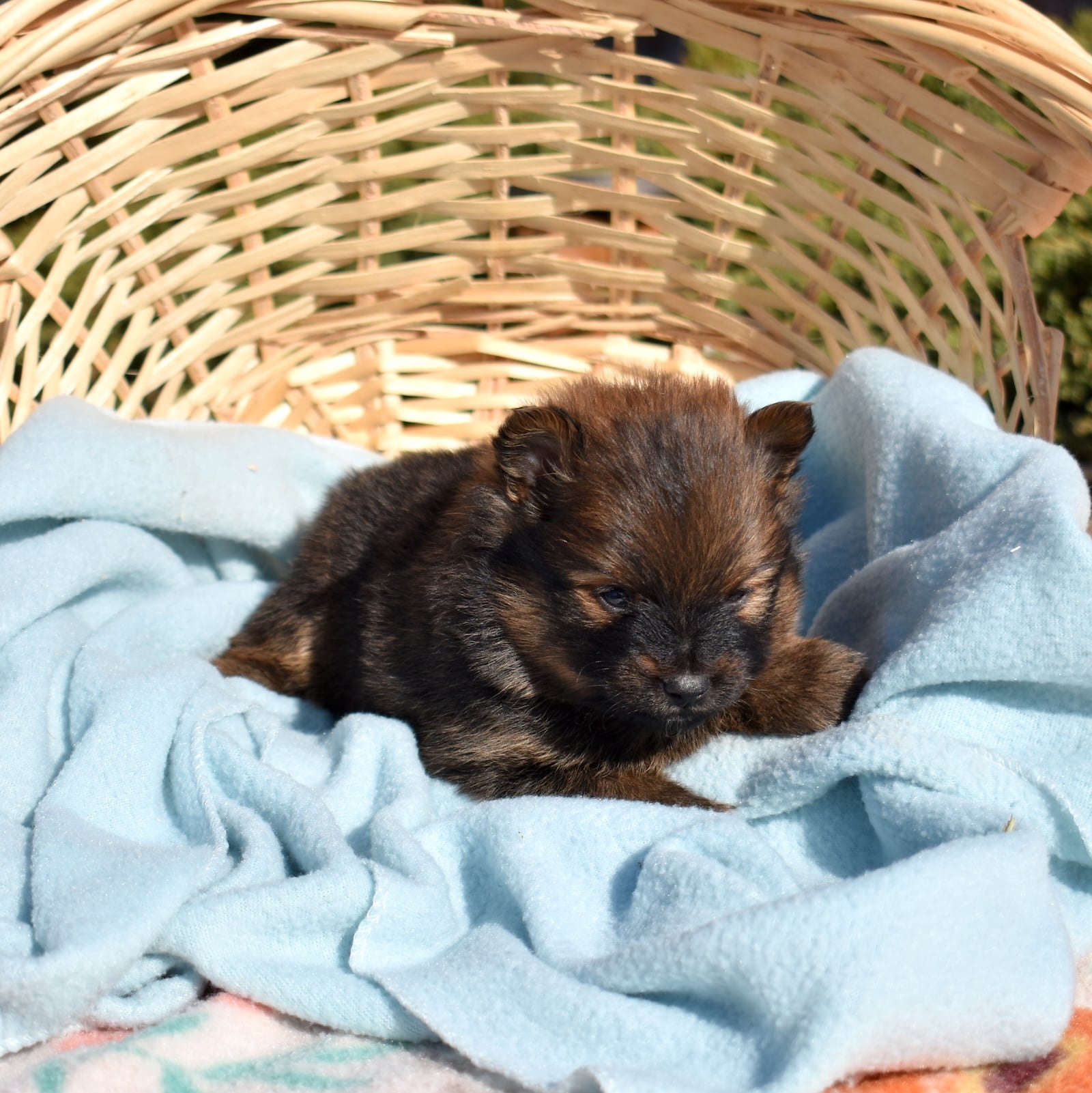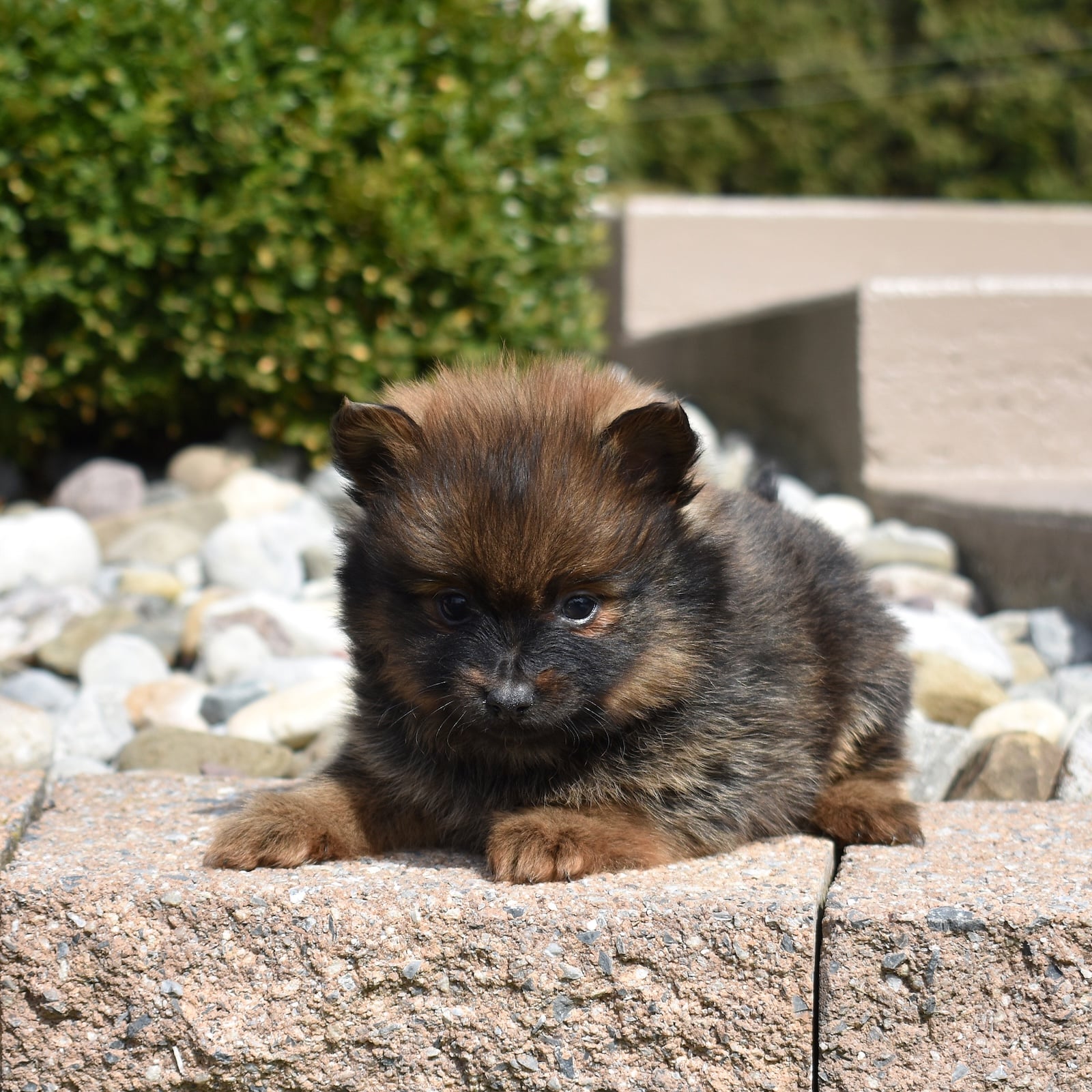 Poppy is a striking little Pomeranian with a beautifully patterned coat featuring rich black and warm brown markings. Her fluffy fur creates a bold contrast that highlights her bright eyes and playful expression. With an expected adult weight of just 5–6 pounds, Poppy will remain a perfectly petite companion while still showcasing the lively personality that makes Pomeranian puppies for sale so popular.