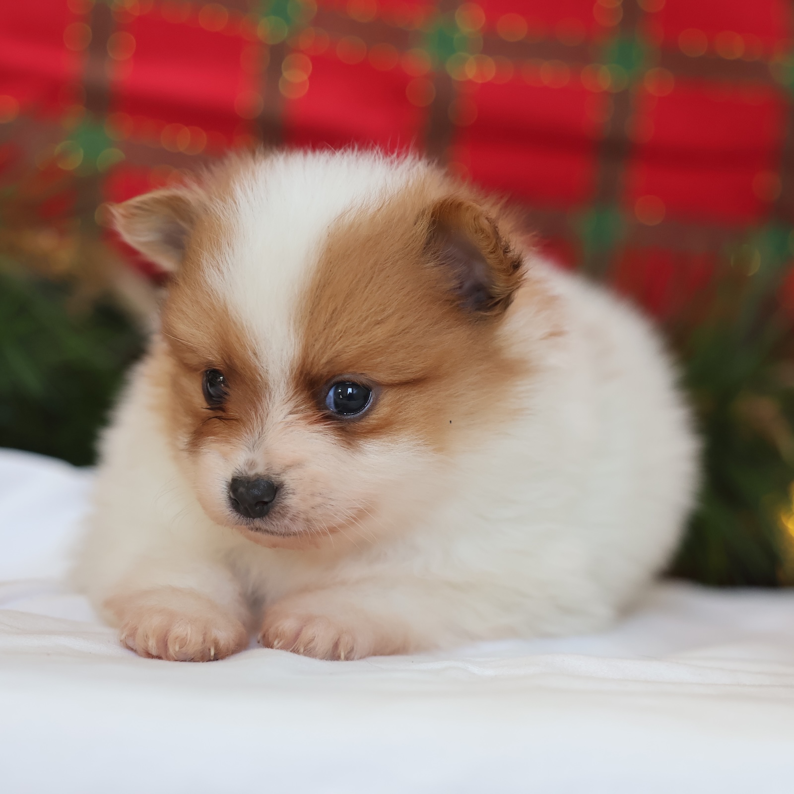 Captain is a standout Pomeranian with a beautiful white coat accented by warm brown markings on his face, giving him a distinguished and expressive look. He carries himself with quiet confidence, a hallmark of the Pomeranian breed. Poms are known for their self-assured personalities, intelligence, and strong attachment to their people, and Captain already shows these traits in his thoughtful, attentive nature.